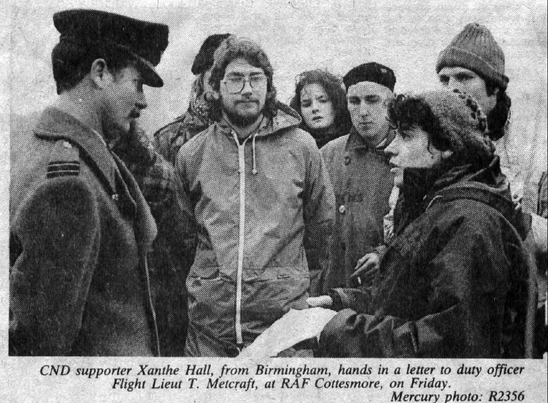 Looking through my old scraps from the eighties before going to the blockade at Büchel, I came across this newspaper cutting of me handing a letter to the duty officer at RAF Cottesmore. Not sure of the date of this action, but I also – digging deeper into my boxes – found a flyer for the action with 16 December as the date, although the year is not on it.