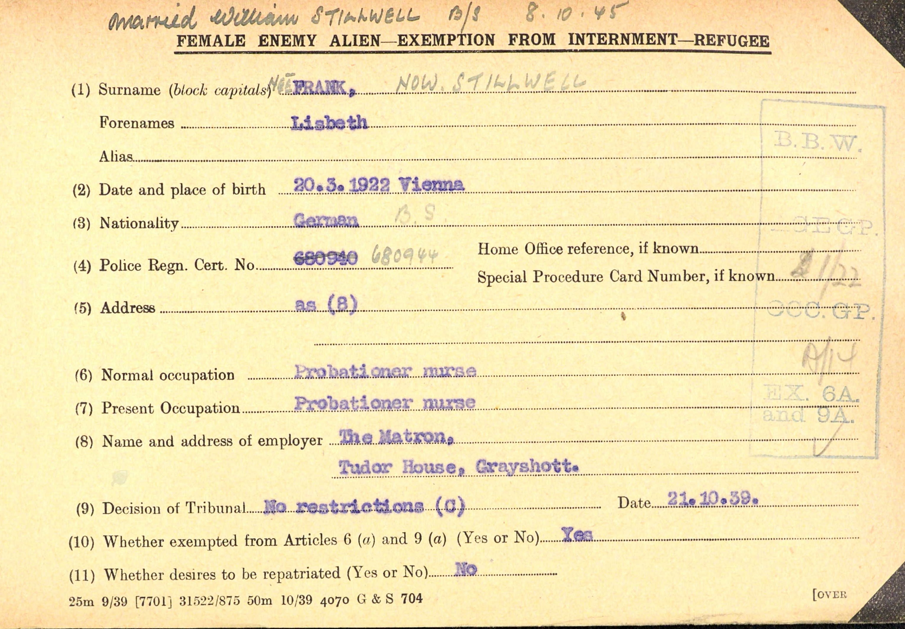 As Lisbeth was working as a nurse during the war, it is quite possible that she met Stilwell while caring for him at a hospital after he was injured. But this is also conjecture. In any case, according to her internment exemption card she was employed at Tudor House in Grayshott as a probationary nurse. Grayshott was an Army town, hosting barracks and training camps, and the Military Hospital in Tudor House. Stilwell was 13 years her senior.